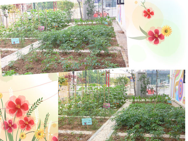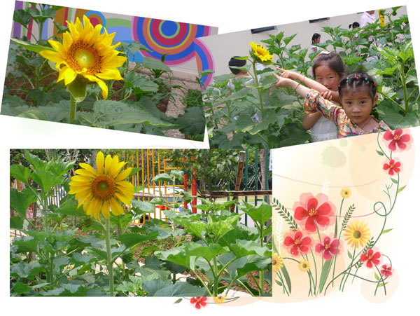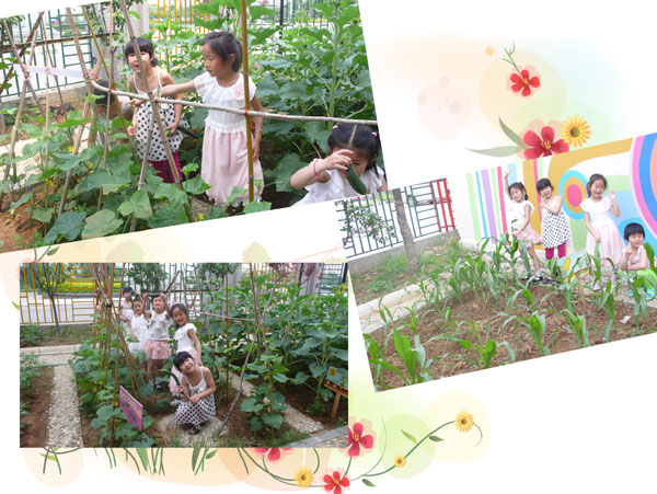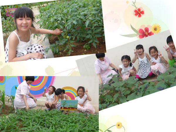 6月4日上午幼儿园大班孩子在自己精心地照顾下的种植园地里去观察自己种植的植物,小小种植园,是孩子们学习的乐园。瞧,孩子们在种植园里高兴的发现向日葵开花了、黄瓜长大了、西红柿快红了,玉米怎么还没有长出玉米呢?空心菜应怎么吃呢?茄子的花怎么是紫色呢?笑声一串串,问题一串串。