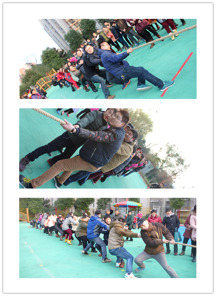 当欢快的儿歌律动音乐响起时,每个班级的孩子展示了早操表演,精彩的表演赢得了在场的家长们热烈掌声。热身的早操表演之后是亲子运动会,运动会根据孩子的年龄特点,分别设置了家长参与性和互动性的项目,主要有“夹球走”、“大脚和小脚、“汽球飞飞飞”、淘气的小乌龟”、“青蛙跳”等项目。比赛中,运动会场朝气四溢,亲子尽情游戏,快乐比赛,欢笑之声不绝于耳,掌声,加油声,融成一片。而《拔河比赛》把活动推向了高潮,让这些家长们仿佛也回到了快乐童年。