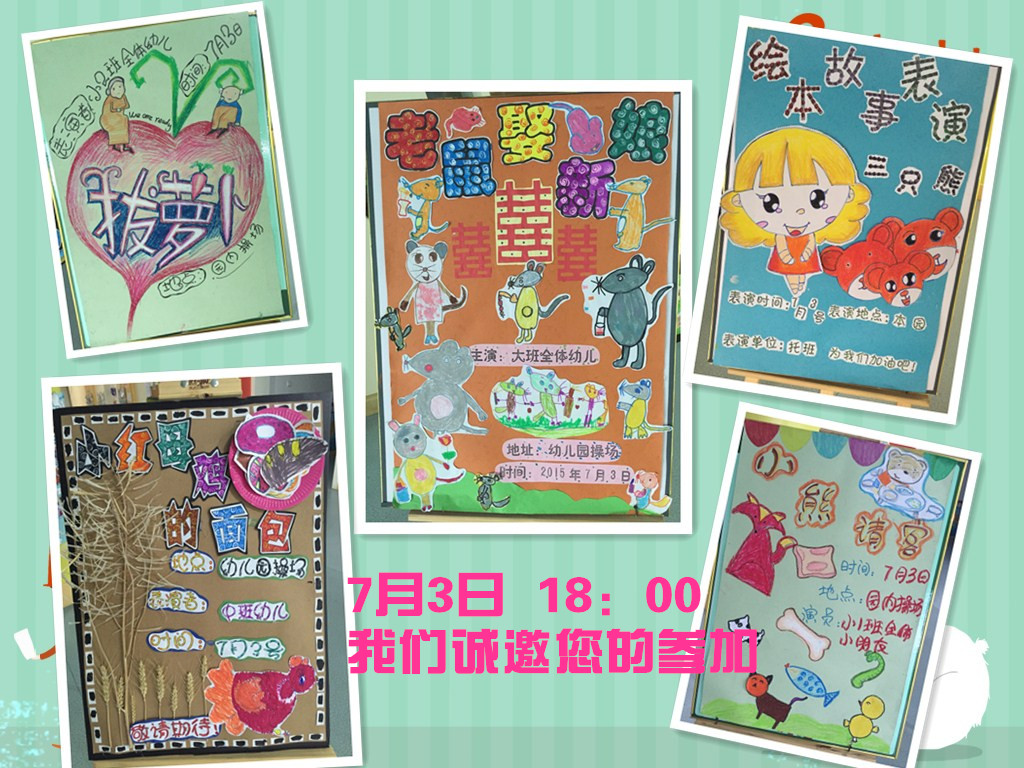 各位家长,您好!本学期我园绘本剧表演活动将在7月3日18:00在幼儿园操场上举行。现在老师和孩子们在紧锣密鼓的准备着。我们诚邀您一起陪同孩子们在奇妙的童话旅途中,与故事相约,与音乐为伴,一起快乐,一起感动!