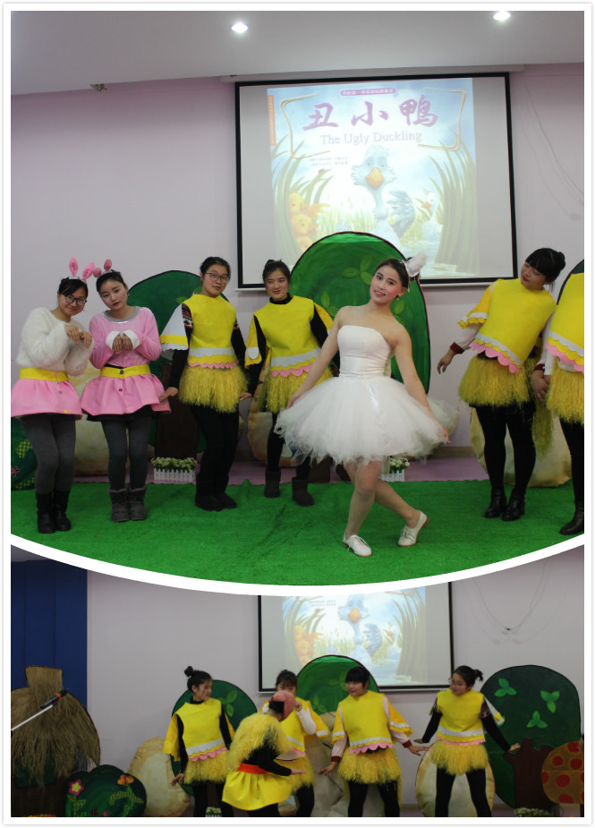 老师们以年级组为单位,排练儿童剧,自己选取题材,制作背景,老师们还用自己的原声进行录音表演,每个年级组都做了充分的准备,认真的排练,精心的设计。表演的剧目分别是《白雪公主》、《丑小鸭》、 在这个过程中从文字(剧本)、表演、美工、音乐、舞蹈锻炼了老师的综合能力,为老师们指导幼儿的表演积累了经验。此次童话剧的推出,旨在激发孩子们对童话故事的兴趣,提高幼儿的语言表达能力,凸现我园童话教育特色,让孩子们在懂道理、学知识的同时,激发起了观看、表达、表现的欲望,为下一步自己表演童话剧奠定了基础。