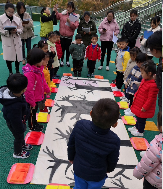 李老师采用接近自然的室外上课模式,运用其富有感染力的话语将孩子们带入到了活动中,孩子们的思维非常集中,运用两种相近色装饰大树,并采用拓印的绘画技创作秋天的树林。