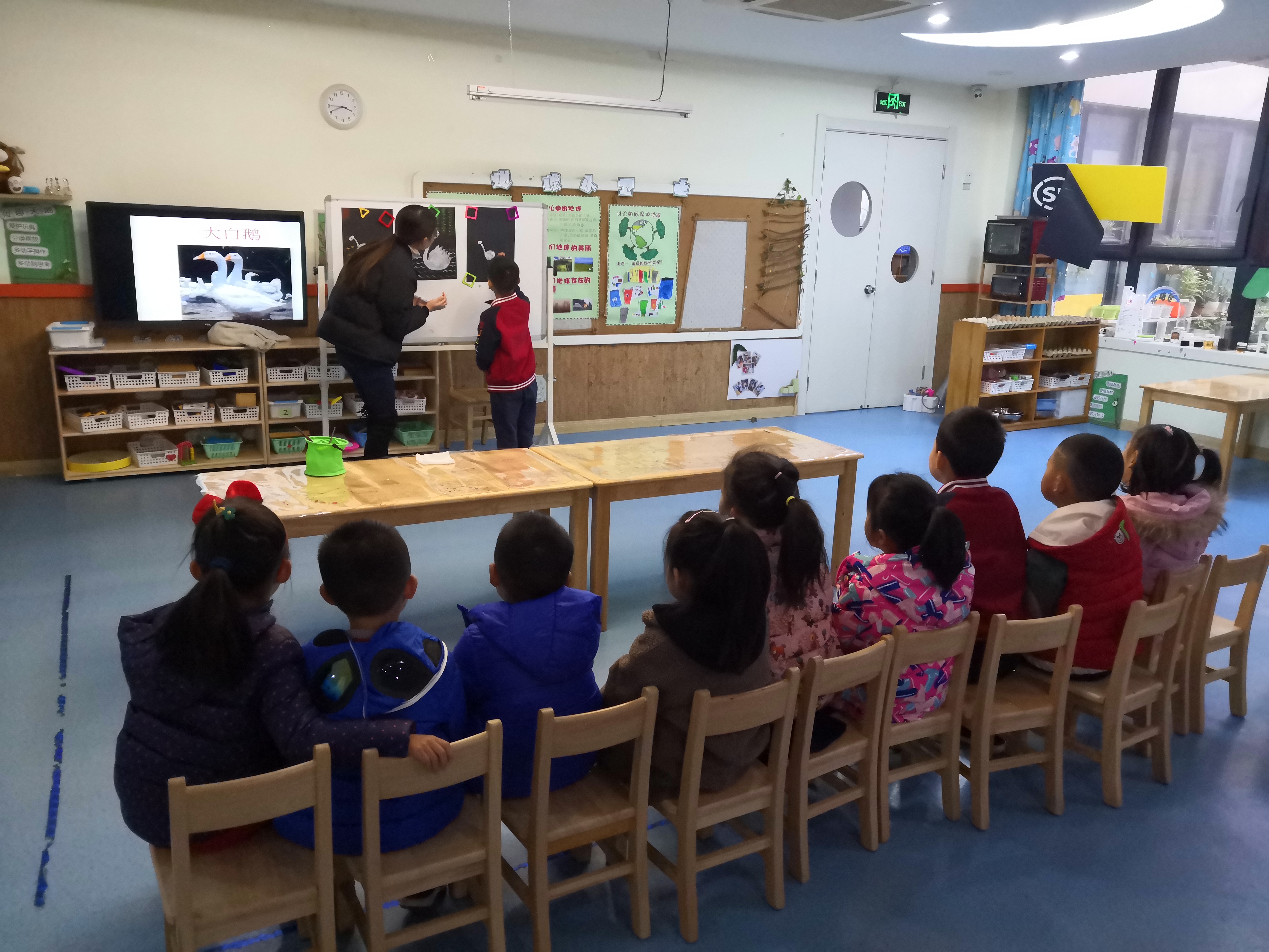 朱老师通过水粉画的方式体现不同形态的大白鹅,同时也详细介绍了大白鹅形态特征,大白鹅的脚、嘴巴以及翅膀,在不同状态下也是不一样的。以图片的形式给幼儿观察,请幼儿去描述,课堂活跃度和互动也非常的多。