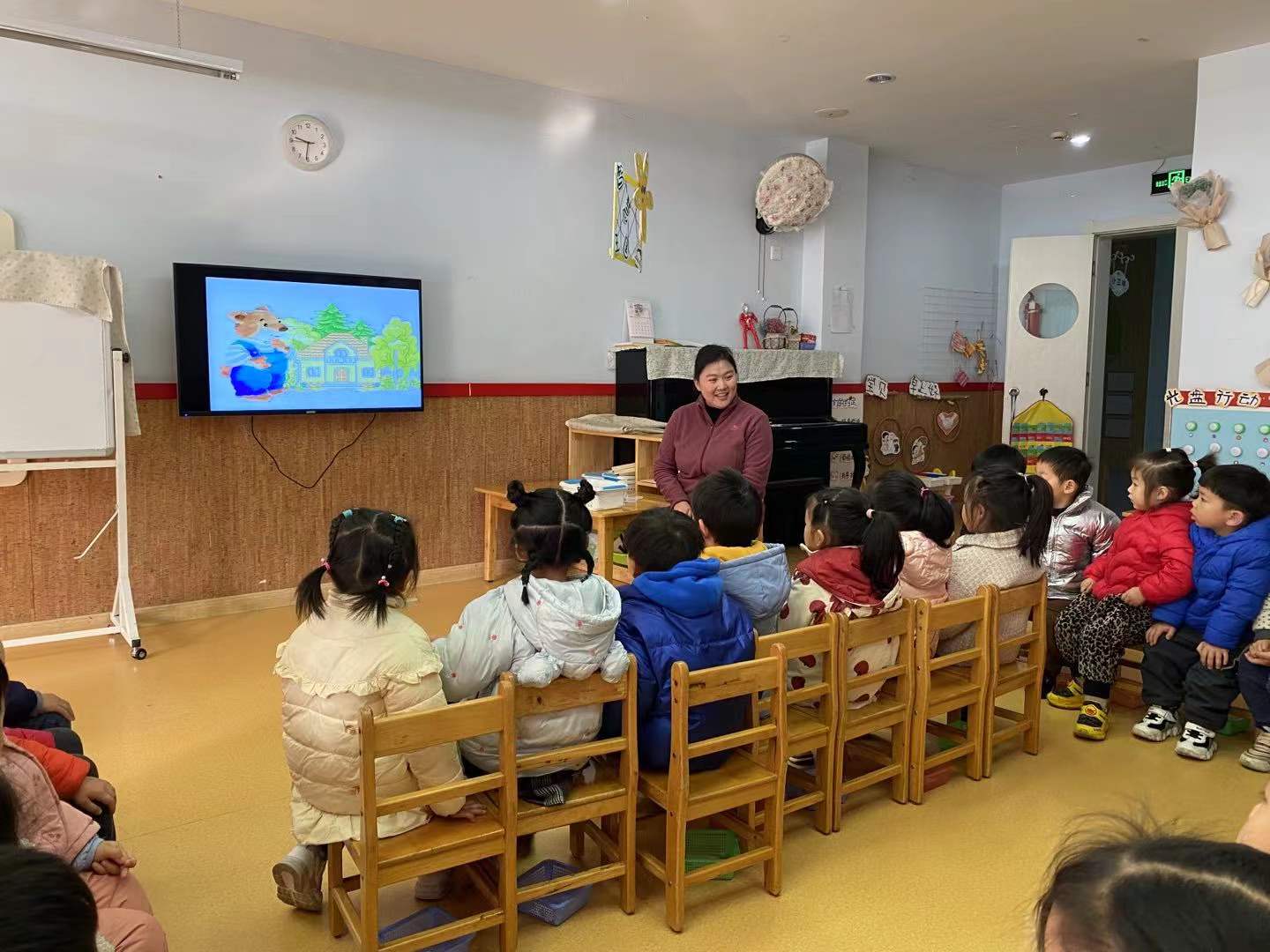 为提高我园教师语言教研活动的提高,促进语言组老师的语言教研活动再上新台阶,2021年12月23日世纪之星幼儿园进行了语言组公开观摩课展示活动(二)本次执教的内容是:任婕老师带来的小班绘本《小熊请客》及方迎年老师小班语言活动《水果宝宝去旅游》。