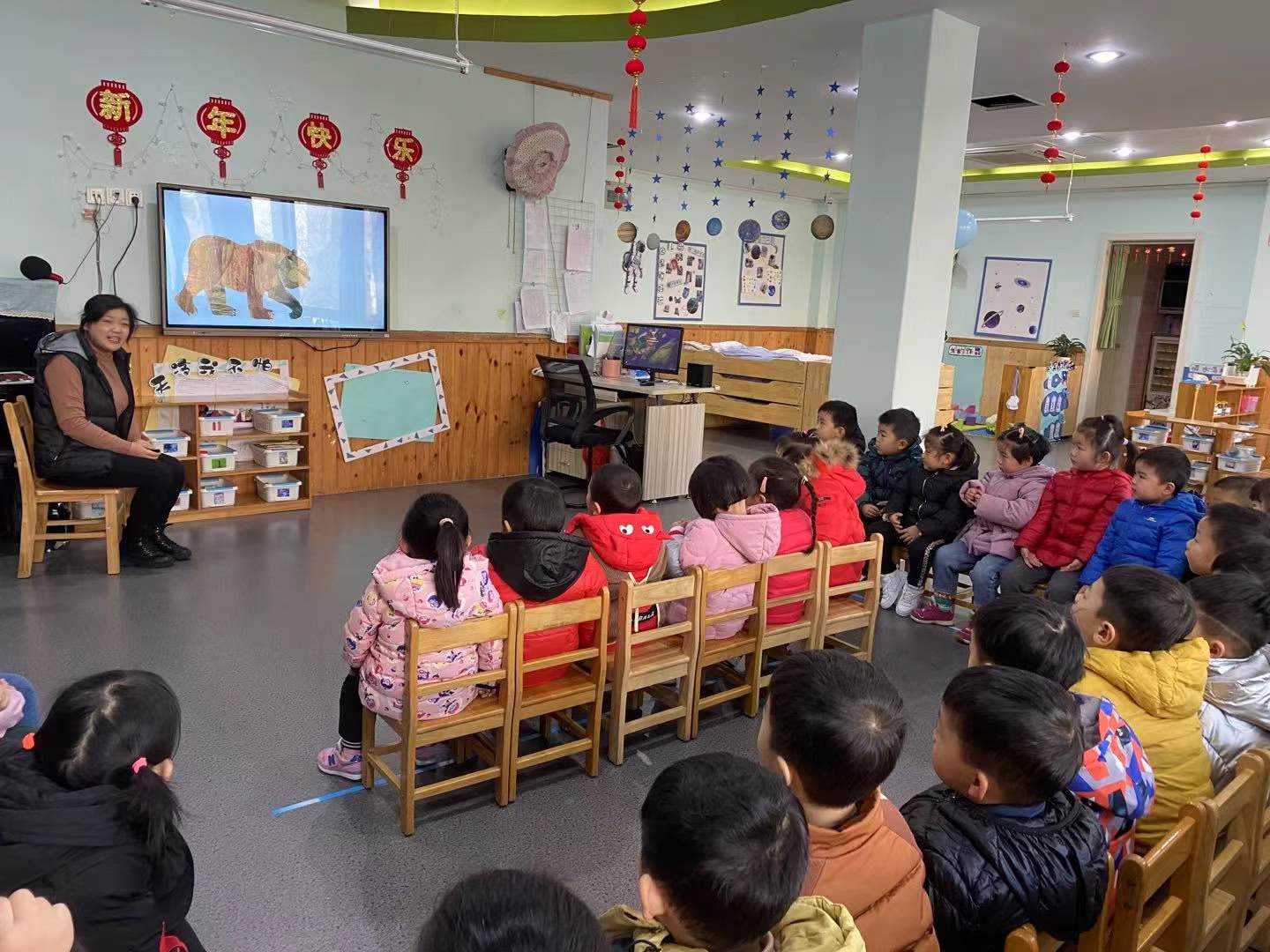 花金英老师在活动伊始以送孩子们新年礼物为导火线出示图书封面,很快地激发了孩子们的兴趣,并用一问一答的方式帮助孩子们了解故事内容,极大地调动了孩子们的参与性。活动最后,花老师将故事用歌唱的形式帮助孩子们复述故事内容,这种新颖的方式不仅能使幼儿熟悉故事内容并乐在其中,是本次活动的点睛之笔。