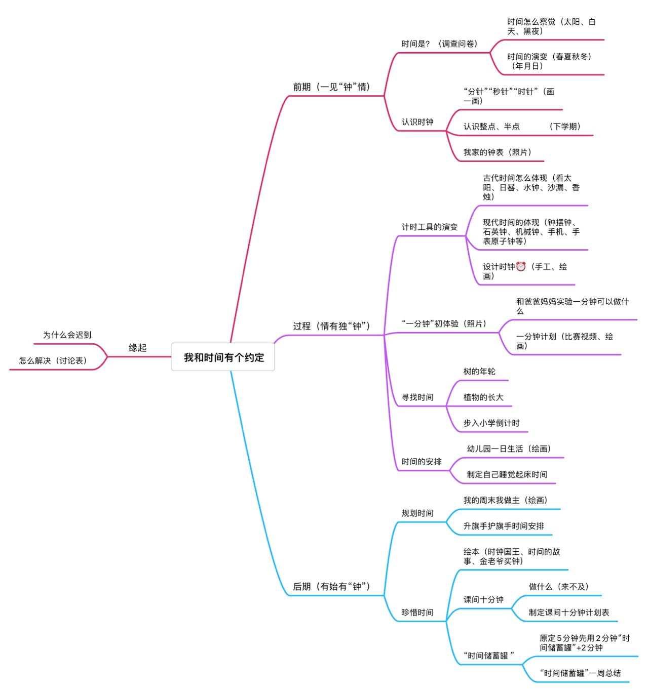 在“我和时间有个约定”的主题活动中,活动内容较多,实施时间为一个月,本班老师提出:活动发展的主要脉络线由老师和孩子共同讨论确定,通过讨论和资料的收集我们决定从三个支架来实施。分别是一见钟情、情有独钟和有始有钟。