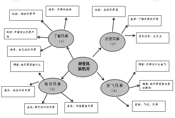 在“迎春风 放纸鸢”的主题活动中,活动内容较多而时间较短,实施时间为两个星期,那这两个星期里如何让孩子全面细致的了解有关风筝的基本知识呢?于是本班老师提出:活动发展的主要脉络线由老师和孩子共同讨论确定,通过讨论和资料的收集我们决定从四个支架来实施。分别是风筝的起源(了解风筝)、我见过的风筝(欣赏风筝)、美丽的风筝(制作风筝)、我和风筝的约会(放飞风筝)。