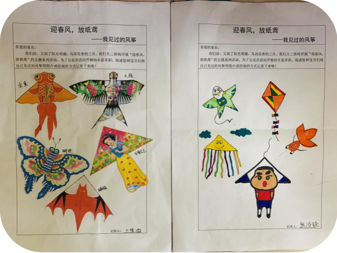 3.对于家长:在本次的《迎春风 放纸鸢》的主题活动中,我们利用家园合作的方式,为幼儿在本次活动中收集、提供了很多材料。家长们的积极配合进一步提高了幼儿参与活动的热情。同时,在做制作风筝这一亲子活动时,促进了幼儿与家长之间的亲子之情。通过本次活动的开展,家长们真切地感受到了家园共育对孩子发展的重要性。