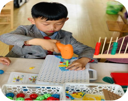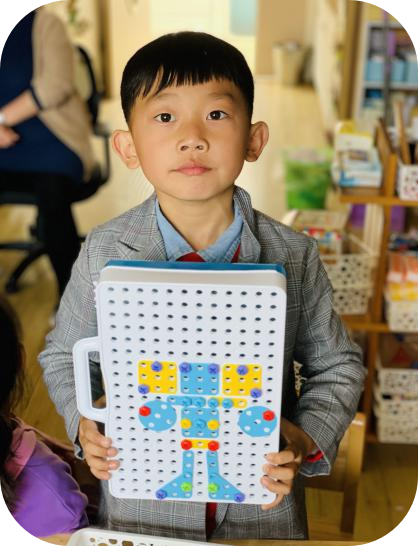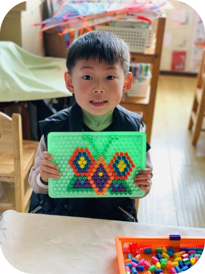 轩轩说:我用蘑菇钉拼了对称的蝴蝶。 王文熙:我用螺丝钉拼的对称机器人。