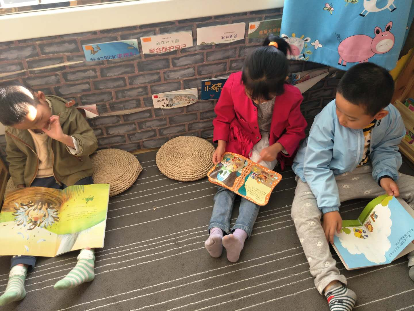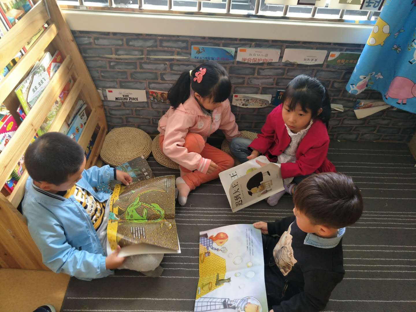 因为这个月我们班的图书区又增添了几本新的绘本,所以迫不及待的想到阅读区,又到了玩区角的时间了,今天豆豆、乐乐、小青等几位小朋友兴高采烈的拿好游戏牌走进了图书区,进入阅读区孩子们立刻脱下鞋子,很快找到了新投放的绘本,安静的坐在地点上看起来。 |