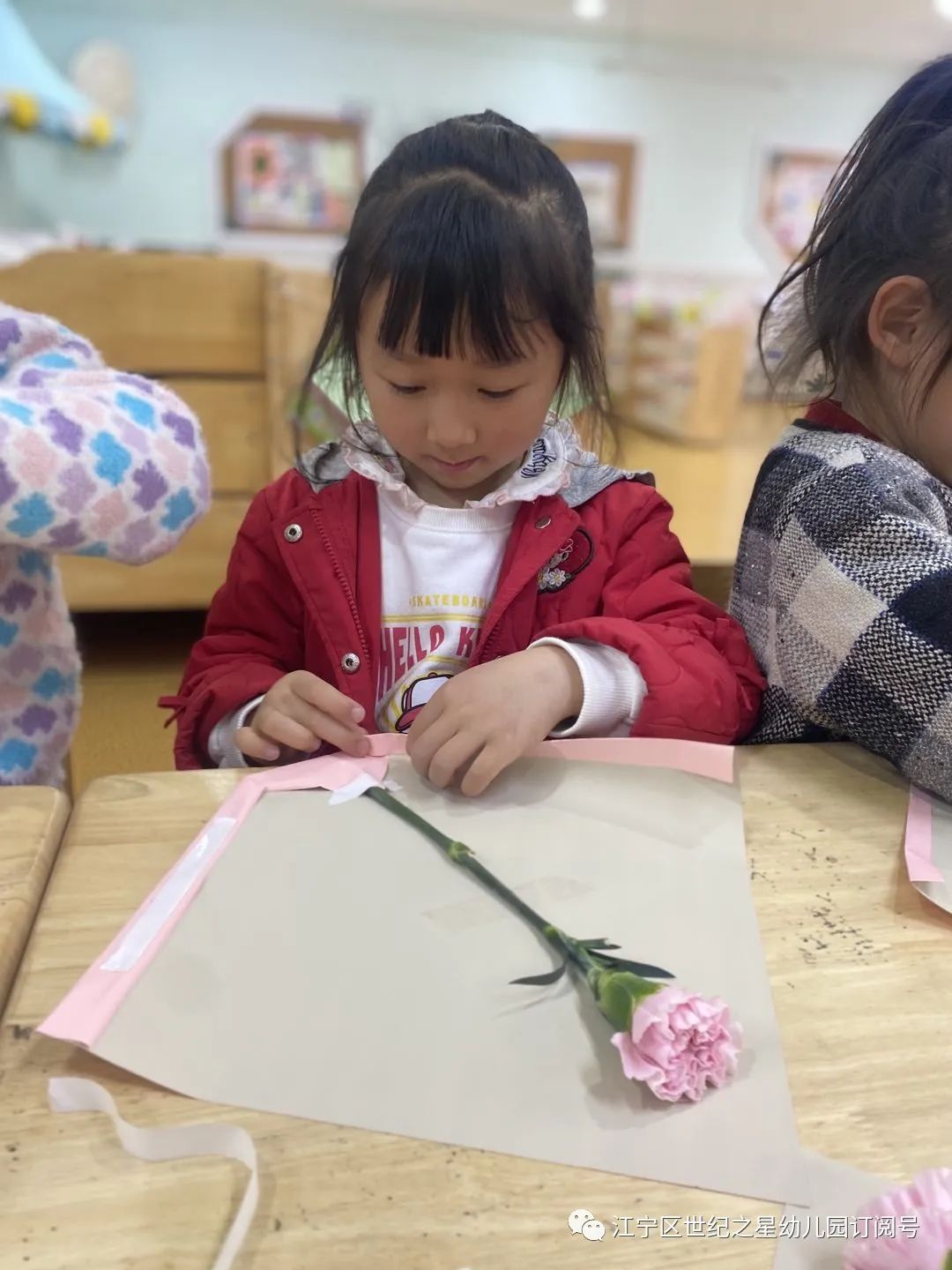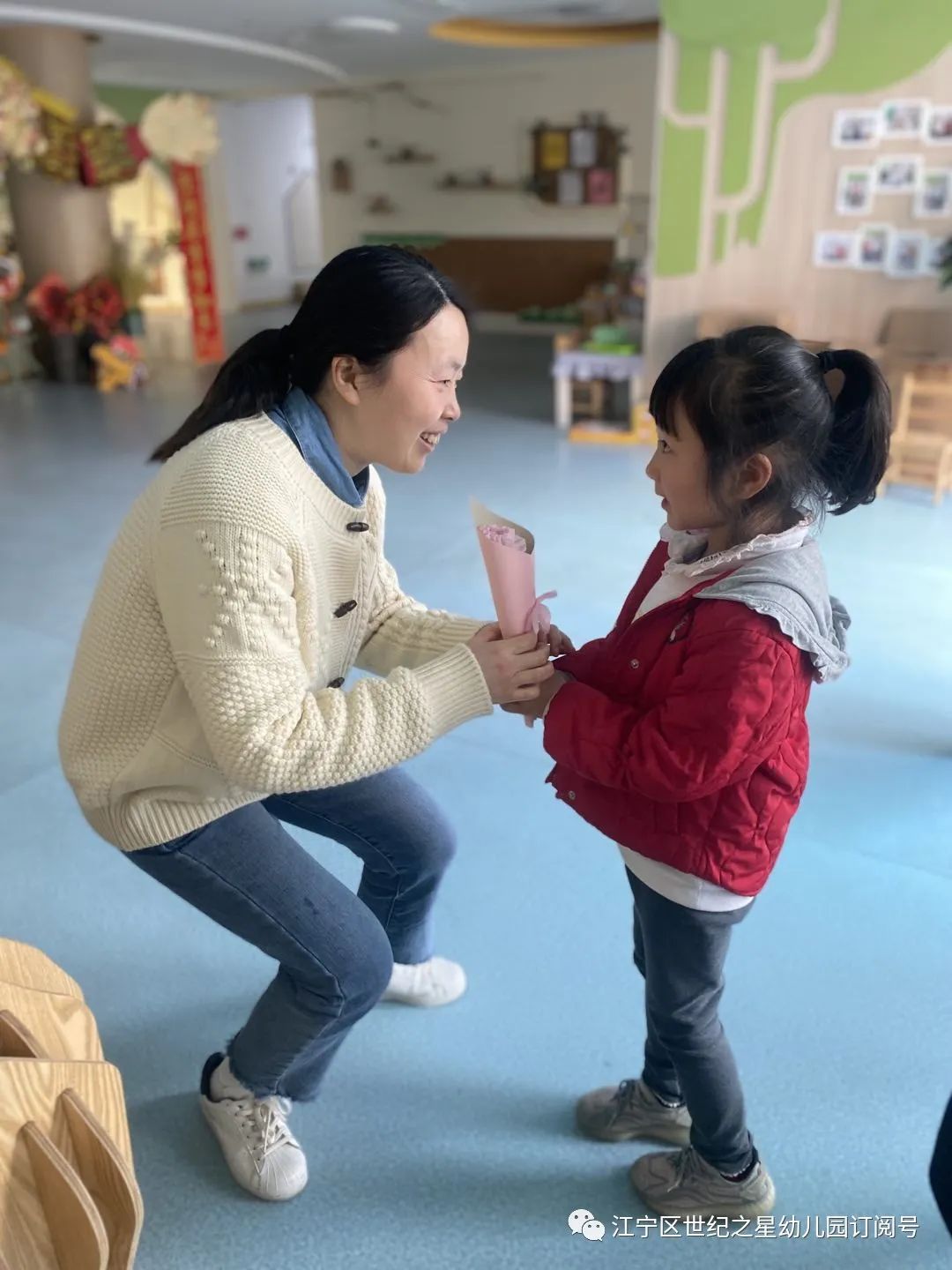大班组:大班组的哥哥姐姐们给女神们献上了一束束鲜花哦!