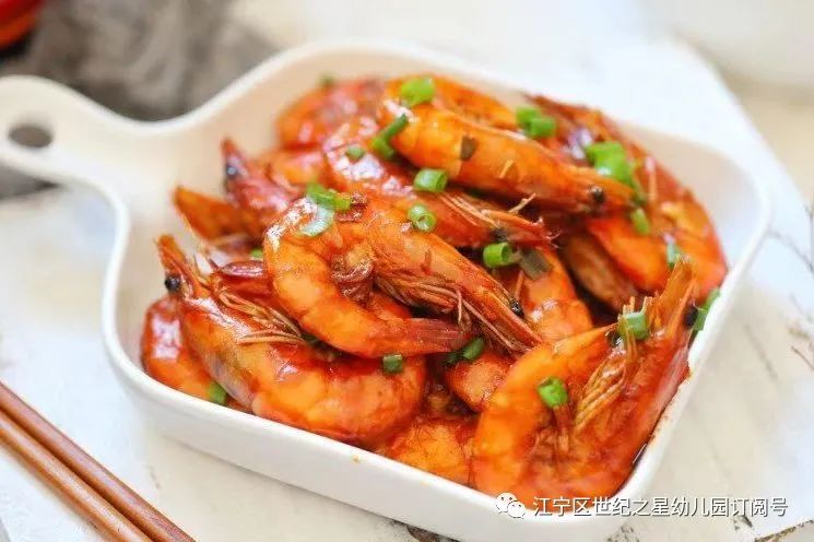 午餐:小米大米饭 红烧大虾 彩椒西葫芦 娃娃菜鸡蛋汤