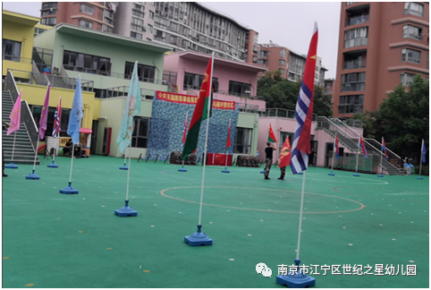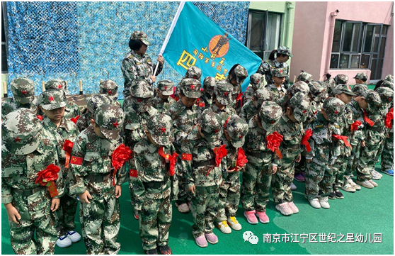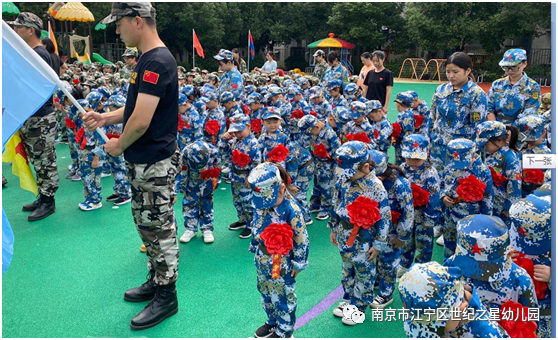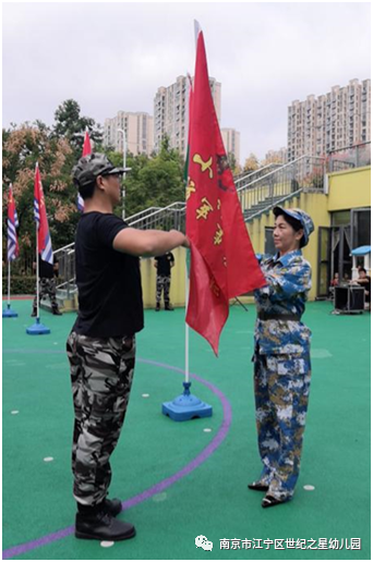 本次活动特邀请了南京动感童年体育特训营的教官们来园对中大班全体幼儿进行基础的军事训练。在简单的爱国主义教育之后,吴园长授予总教官军训团团旗,总教官给各班颁发班旗。