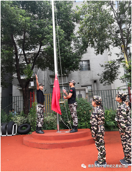 上午09:00,我们的开营仪式准时拉开序幕。小朋友们身着迷彩服,排成整齐的队列,目光坚定。教官叔叔们和我们小朋友组成英姿勃发的护旗队,迈着正步整齐入场。此刻,全场目光凝聚在鲜艳的国旗上,伴随着庄严的国歌声,五星红旗冉冉升起,全体行注目礼,站军姿,向国旗表达自己的敬意。