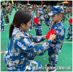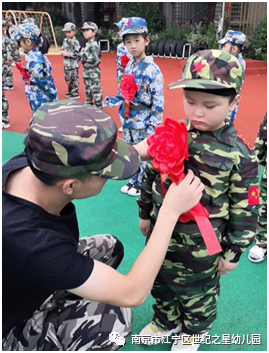 随后,由园长、教官、老师们分别给小兵王国防军事教育课程的各营小战士佩戴光荣之花,阳光下孩子们精神抖擞地“立正”,像一颗颗挺拔的松树,欣喜的接受光荣花。