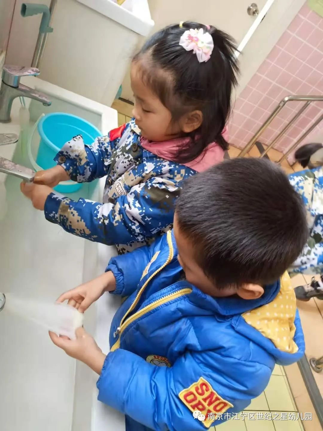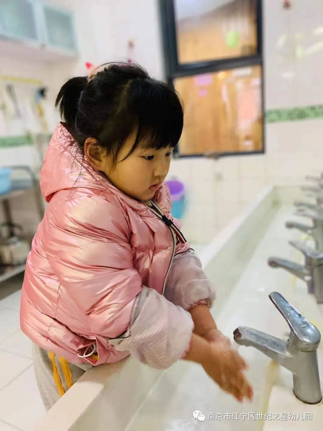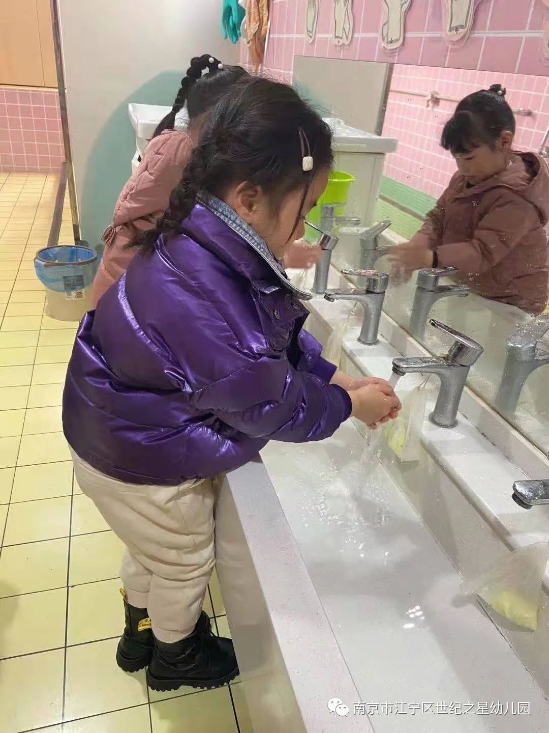 用餐前,孩子们都会主动用正确的方法洗手。