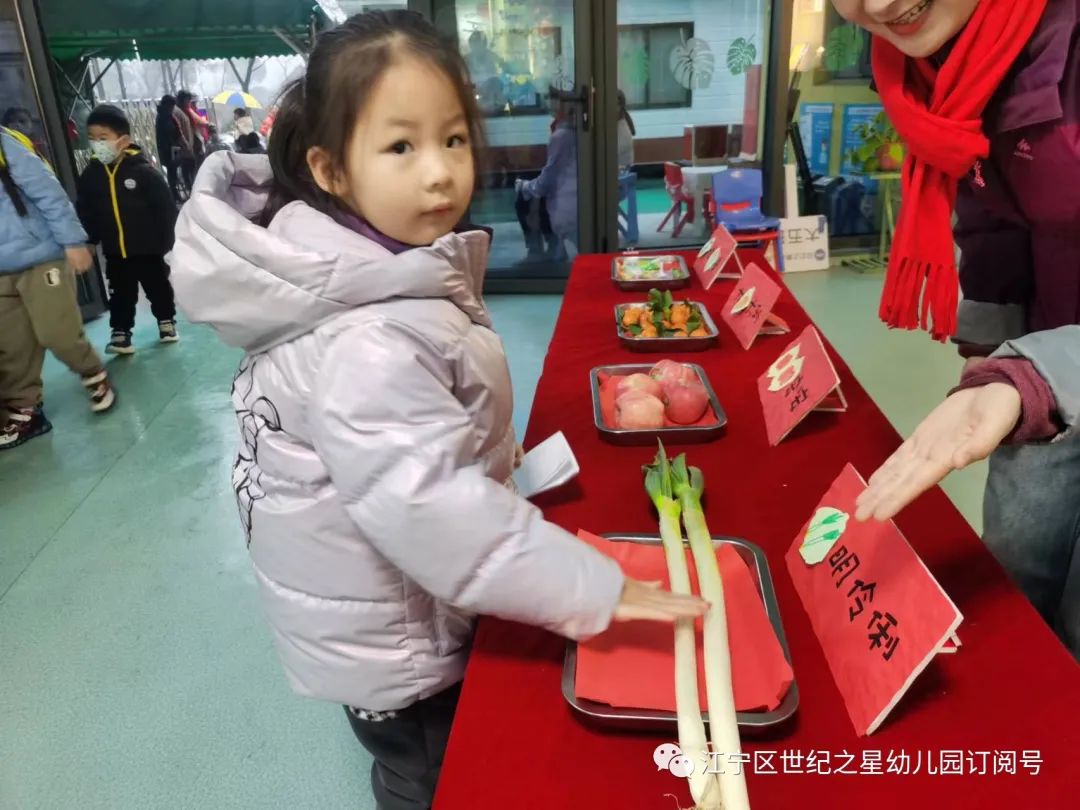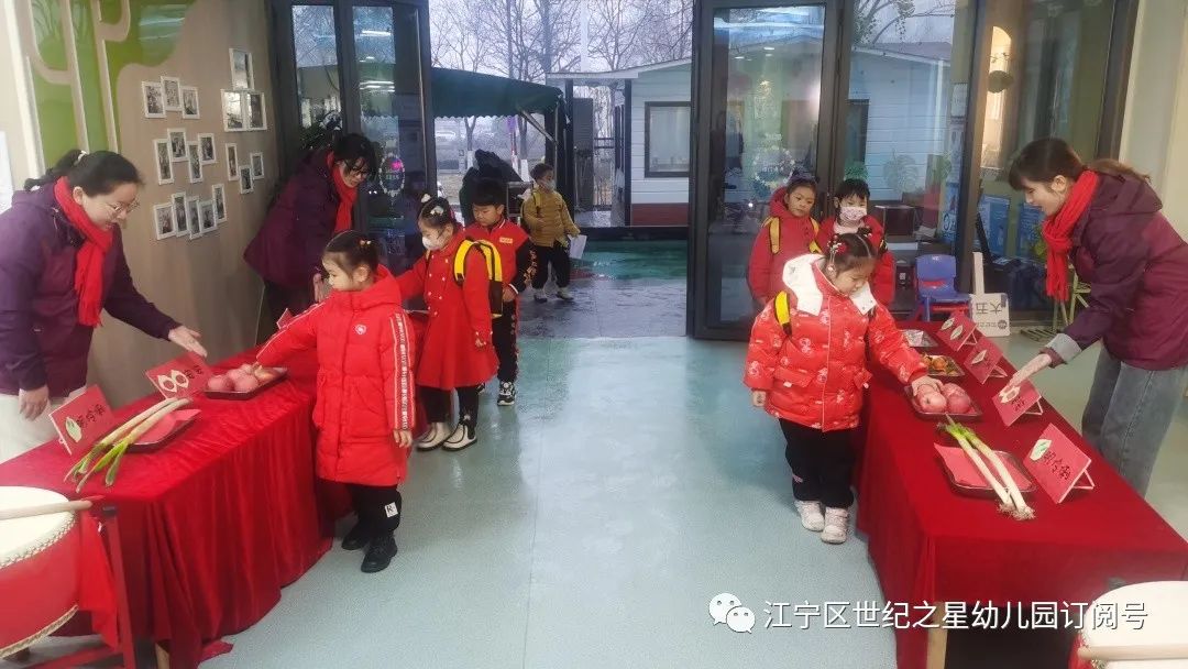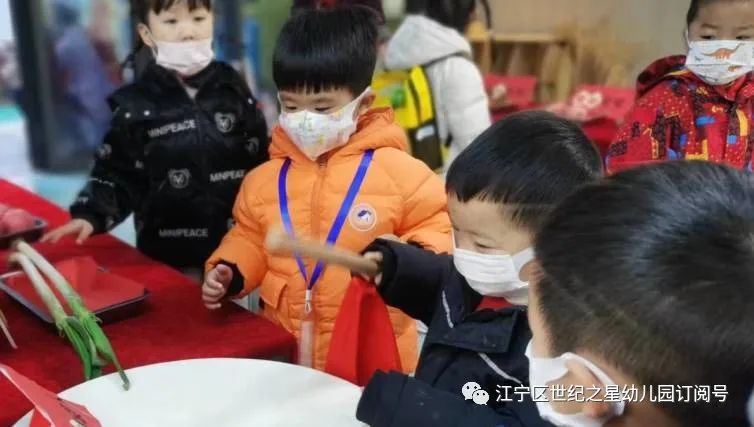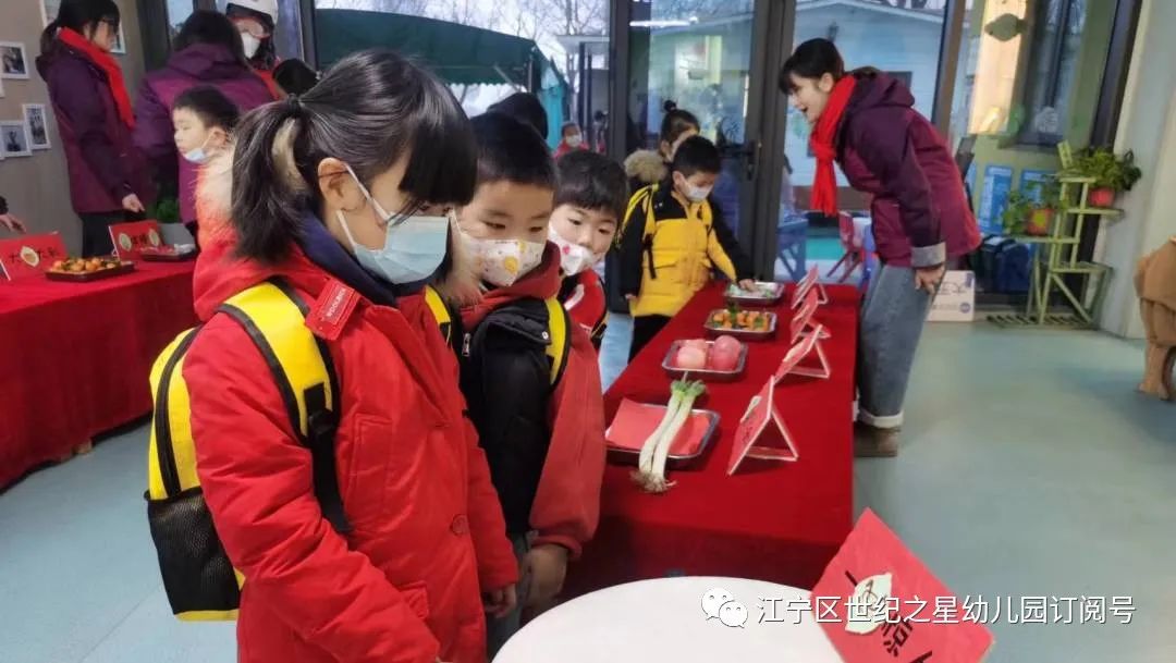 门厅摆设了棒棒糖、桔子、苹果、大葱等,它们代表着不同的含义。孩子们用小手触摸,耳边传来老师声声爱意满满的祝福。